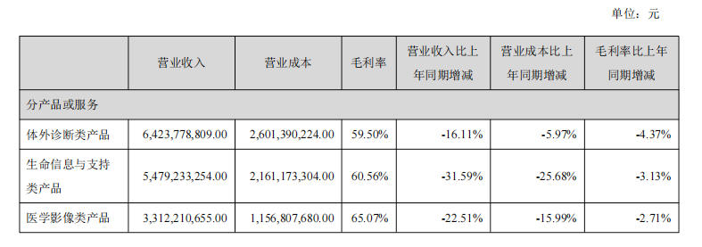 但把2025年中报分项拆开看,三大业务都出现明显下滑——体外诊断、生命信息与支持、医学影像收入分别同比下滑16.11%、31.59%和22.51%,毛利率也同步下降了4.37个、3.13个和2.71个百分点。