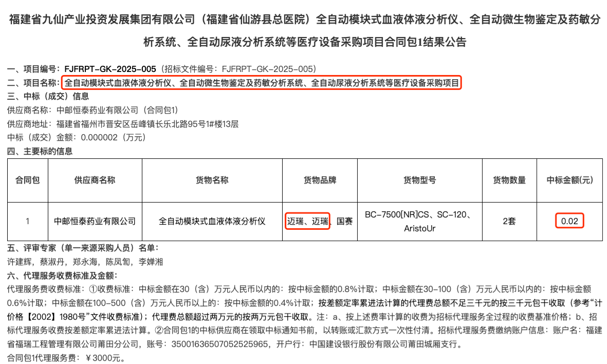 《财中社》注意到,类似情况在其他地区也有所发生。河南的设备采购中,迈瑞医疗的彩色超声诊断设备单价仅为36万元,远低于80万元的预算;在福建省的采购项目中,迈瑞的全自动血凝分析仪和全自动糖化血红蛋白分析仪分别以0.03元和0.02元的价格中标。