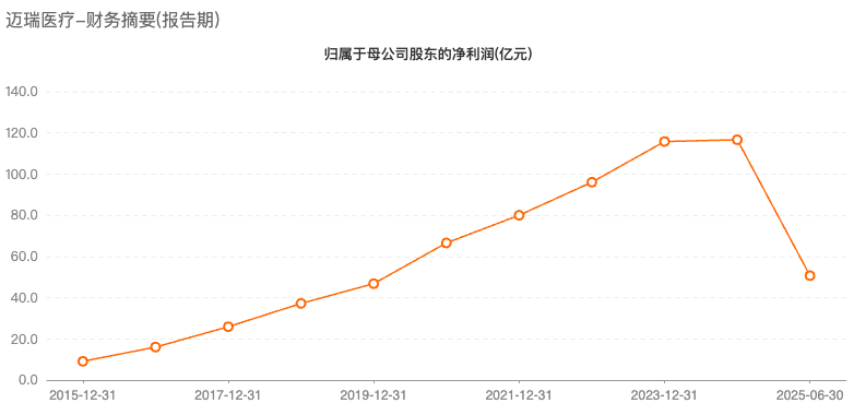 然而,与以往两次上市时的高歌猛进不同,如今的迈瑞医疗正站在一个充满挑战的十字路口:2025年上半年,公司迎来了回归A股七年来的首次业绩“双降”,营收同比下降18.45%,净利润下滑32.96%。