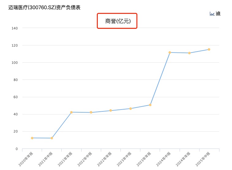 在全球化路径上,迈瑞倚重并购来实现技术补全与市场开拓,从收购Datascope、Zonare、德国DiaSys、海肽生物等一系列案例中可见一斑。然而,并购也带来商誉高企的问题。近五年来,公司商誉不断攀升,截至2025年上半年余额已高达115.1亿元,占总资产19.6%,若未来并购资产业绩不及预期,将面临减值风险。