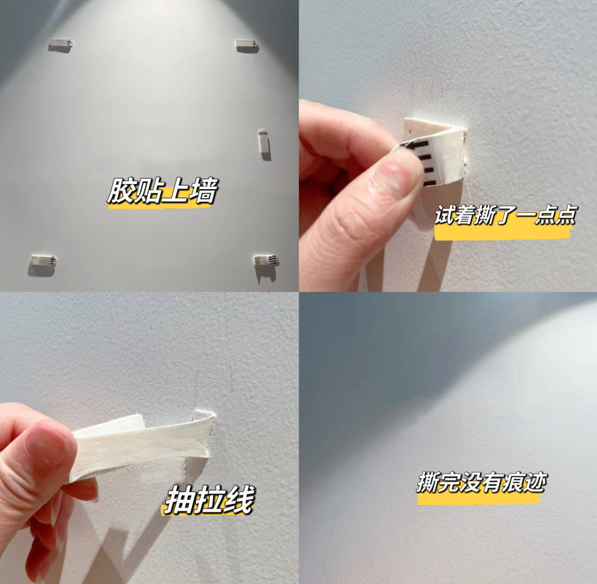 并且,值得欣慰的是,它与一般胶贴也不同,它后面有一个抽拉线,不用的时候抽掉抽拉线,墙上就一点胶痕也不会留。