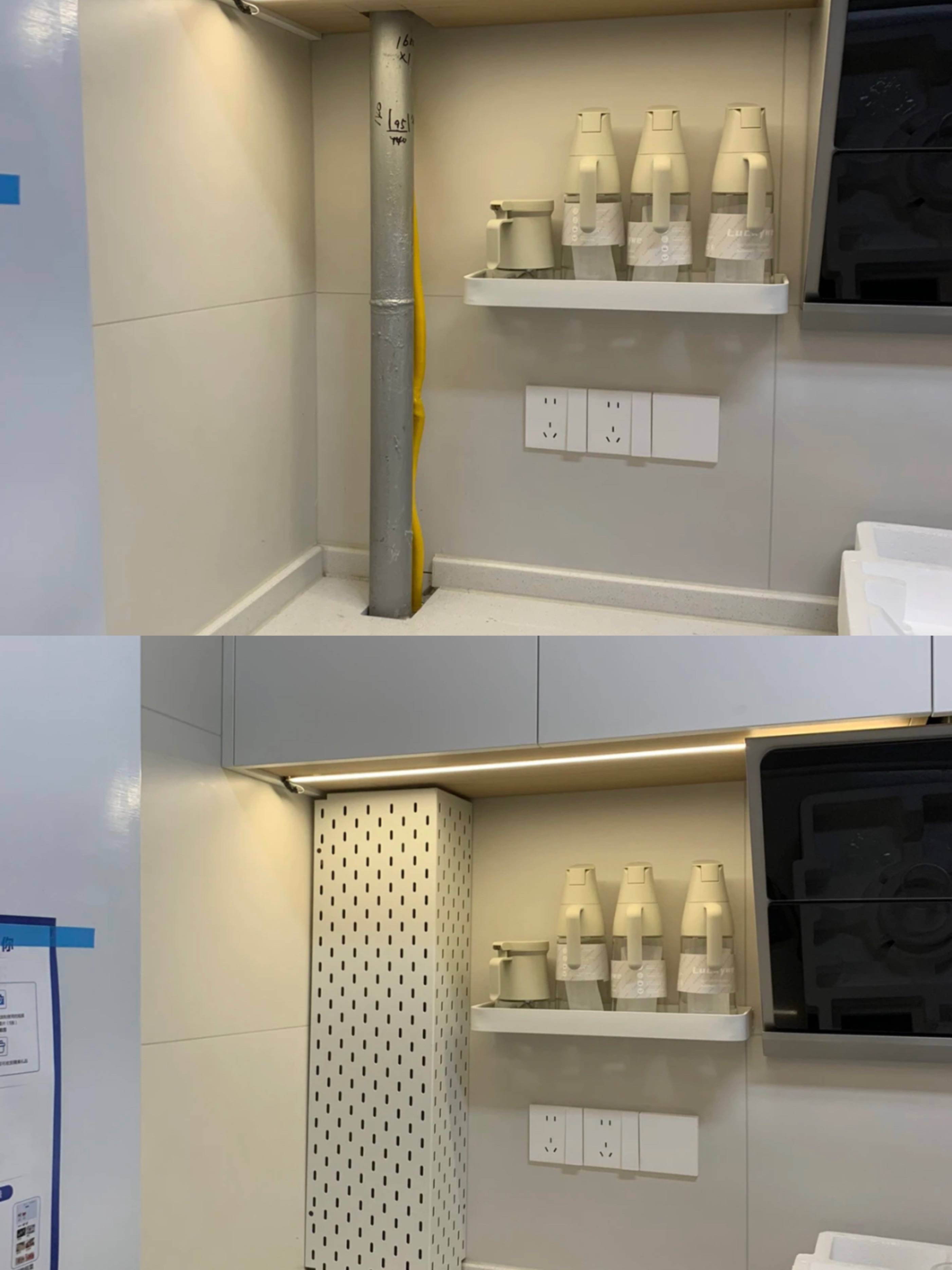 第三种,是在第二种的基础上多点实用性,可以选择洞洞板,遮丑的同时,洞洞板本身具有收纳能力,等于添置了一块收纳空间。